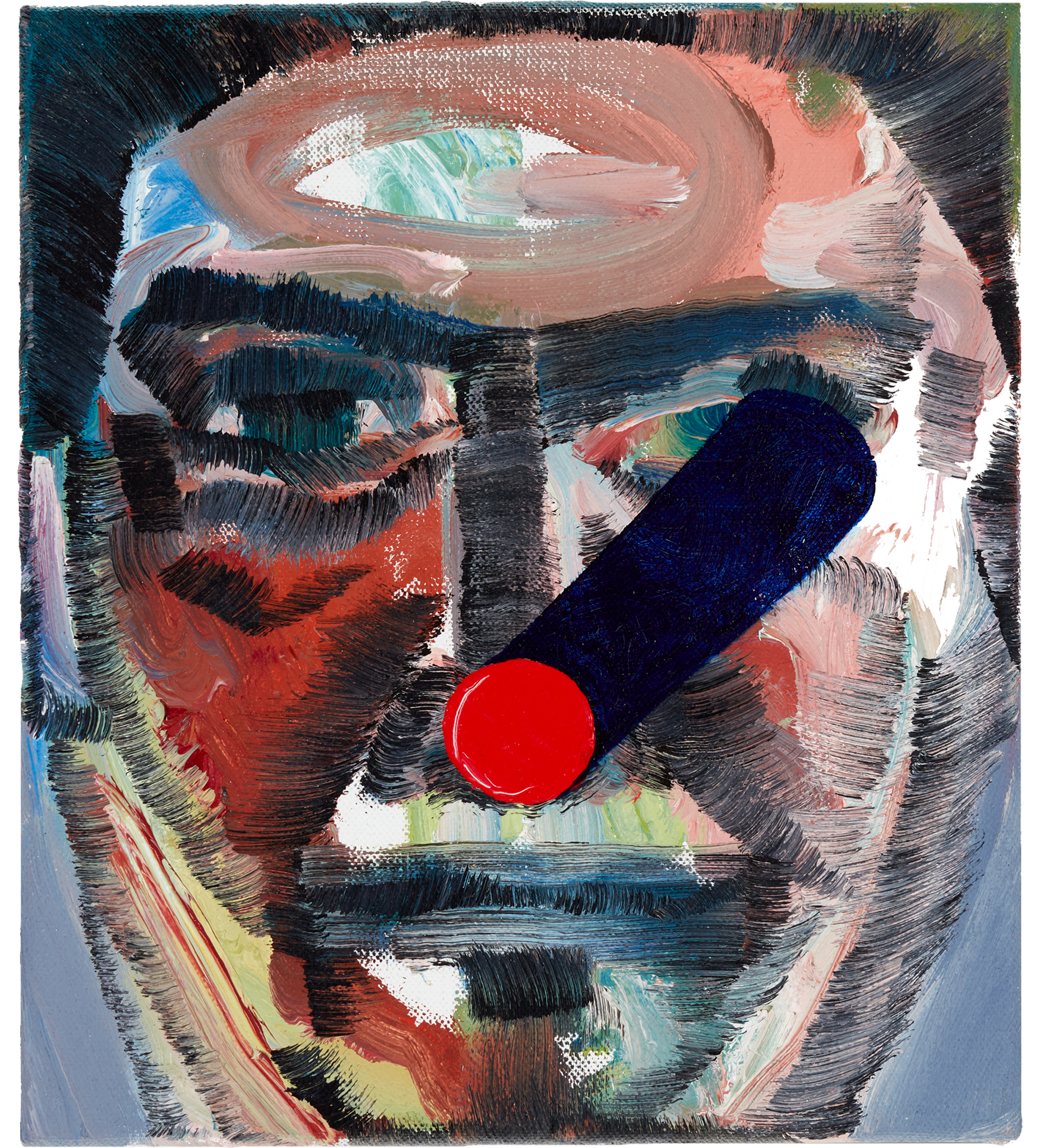 16 Tray portrait (description, self-portrait plus handkerchief I), 2021, oil paint on canvas, 47 x 49 cm